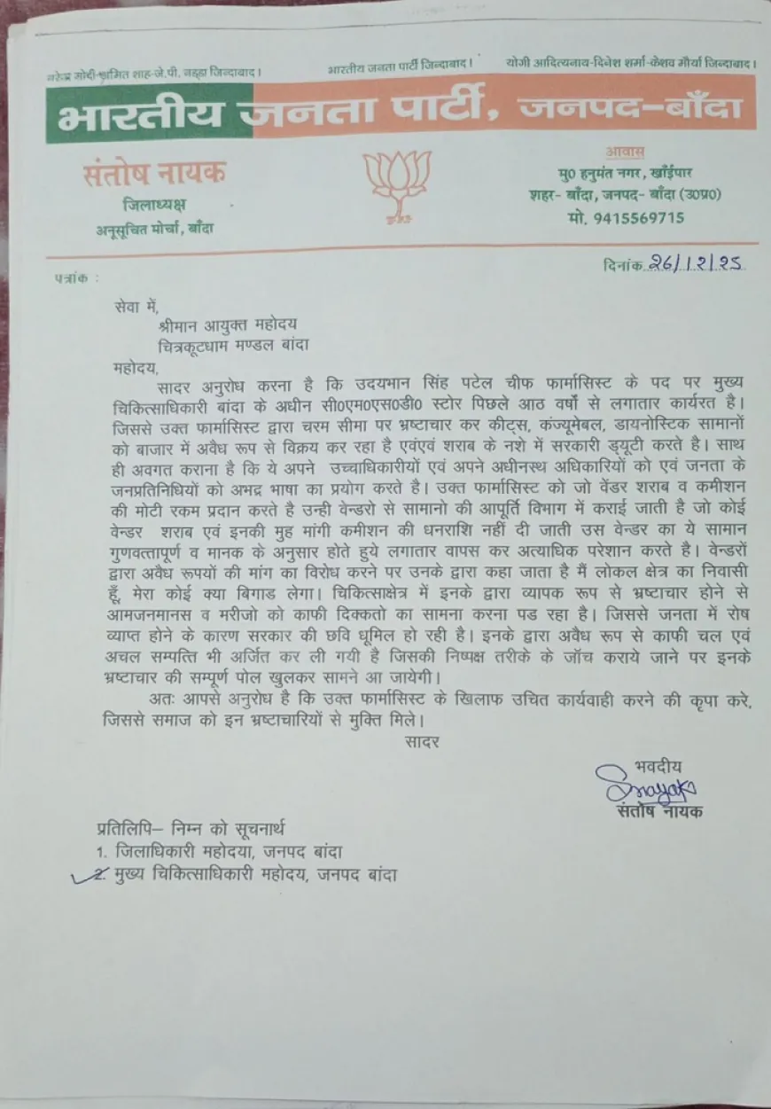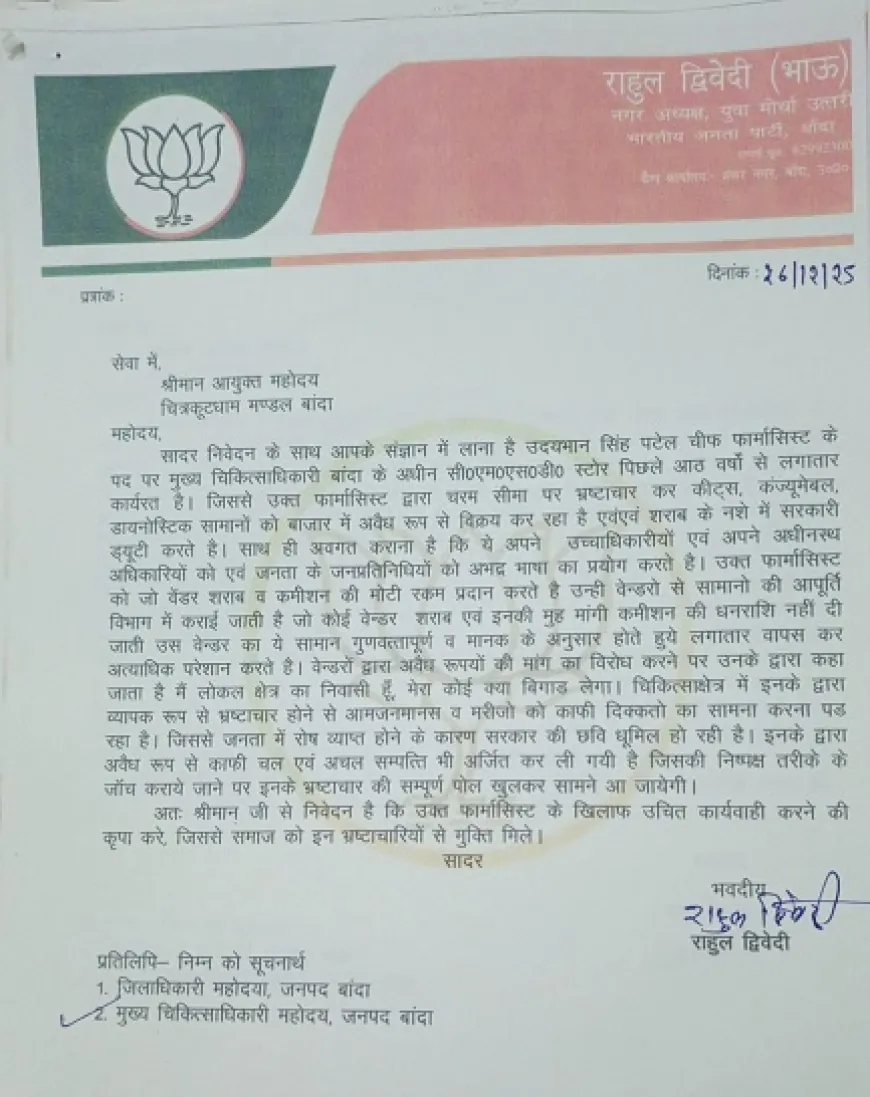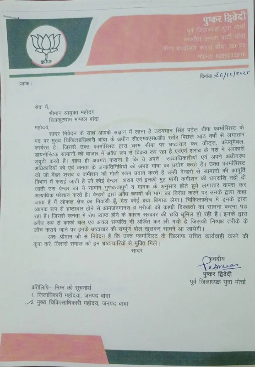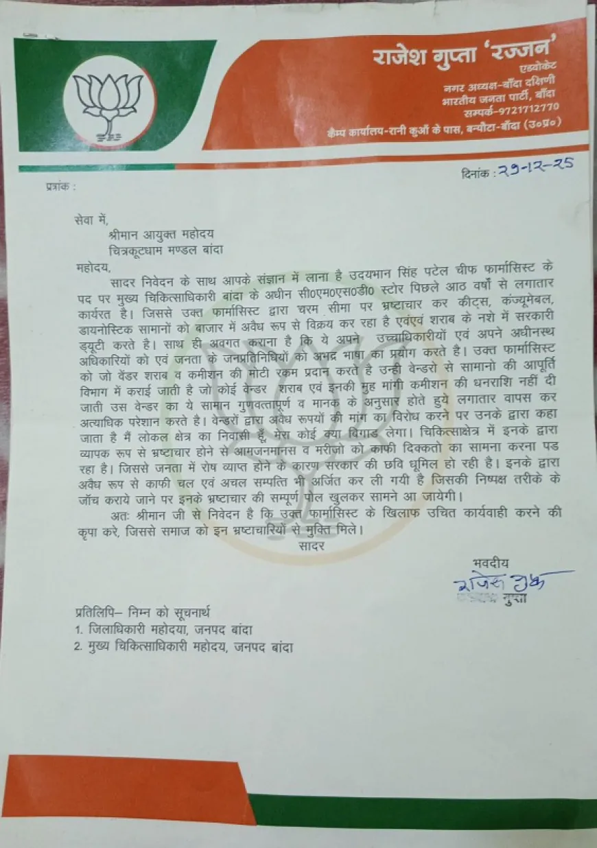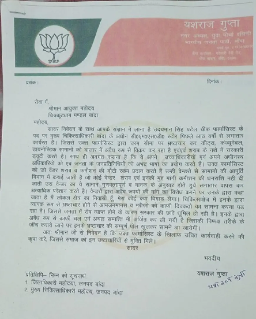 बांदा: चरम पर है चीफ फार्मासिस्ट का भ्रष्ट्राचार, भाजपा नेताओं ने मंडलायुक्त से की कार्यवाही की मांग