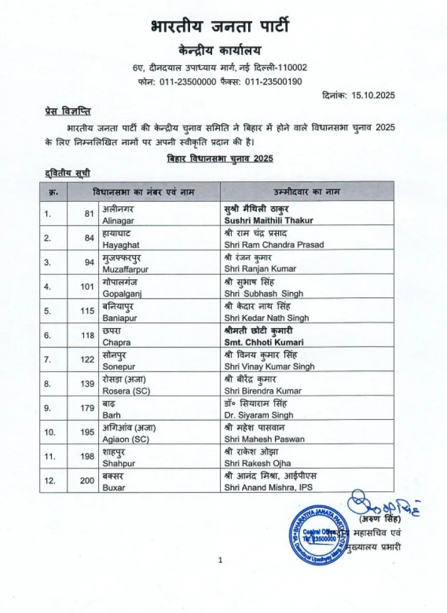 पटना/जनमत न्यूज़:- बिहार विधानसभा चुनाव 2025 को लेकर भारतीय जनता पार्टी (BJP) ने अपने प्रत्याशियों की दूसरी लिस्ट जारी कर दी है। इस सूची में कुल 12 उम्मीदवारों के नाम शामिल हैं। खास बात यह है कि कुछ दिन पहले ही बीजेपी में शामिल हुईं लोकगायिका मैथिली ठाकुर को अलीनगर विधानसभा सीट से टिकट दिया गया है।