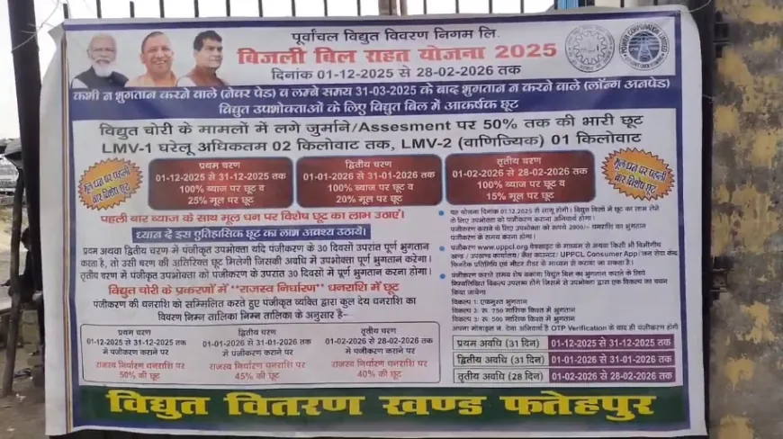 फतेहपुर/जनमत न्यूज। जिले में लंबे समय से बिजली बिल न जमा कर पाने वाले ‘नेवर पेड’ एवं बकायेदार उपभोक्ताओं को विद्युत बिल राहत योजना के तहत बड़ी राहत मिली है। तीन चरणों में संचालित इस योजना के अंतर्गत जनपद में हजारों उपभोक्ताओं ने पंजीकरण कर बकाया बिल जमा कर भारी छूट का लाभ उठाया है।