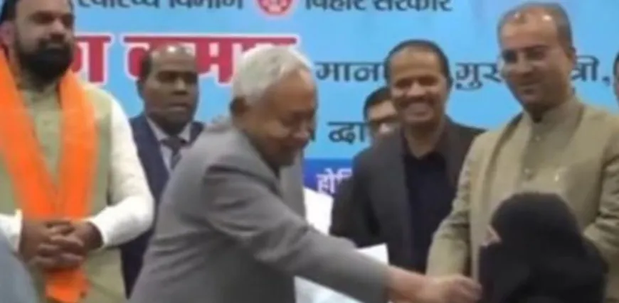 सोमवार को पटना में मुख्यमंत्री नीतीश कुमार एक नई रिक्रूट हुई आयुष डॉक्टर को नियुक्ति पत्र दे रहे थे। महिला हिजाब लगाकर उनके सामने पहुंची थी। नीतीश ने सबके सामने स्टेज पर उस डॉक्टर का हिजाब खींच दिया। यह कार्यक्रम सीएम के सेक्रेटेरिएट में था। यहां 1000 आयुष डॉक्टरों को अपॉइंटमेंट लेटर दिए जा रहे थे। घटना का वीडियो काफी वायरल है।