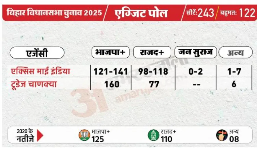 राज्य में मतदान के बाद करीब 15 चुनाव प्रबंधन कंपनी और एजेंसियों ने एग्जिट पोल जारी किए थे। इन 15 में से करीब 14 एग्जिट पोल में साफ तौर पर एनडीए को बहुमत मिला था। वहीं महागठबंधन को मात्र कुछ ही एग्जिट पोल में बहुमत के करीब दिखाया गया था। जबकि राज्य में तीसरे मोर्चे के तौर पर सामने आए जनसुराज पार्टी को शायद ही किसी एग्जिट पोल ने दहाई का आंकड़ा दिया था।