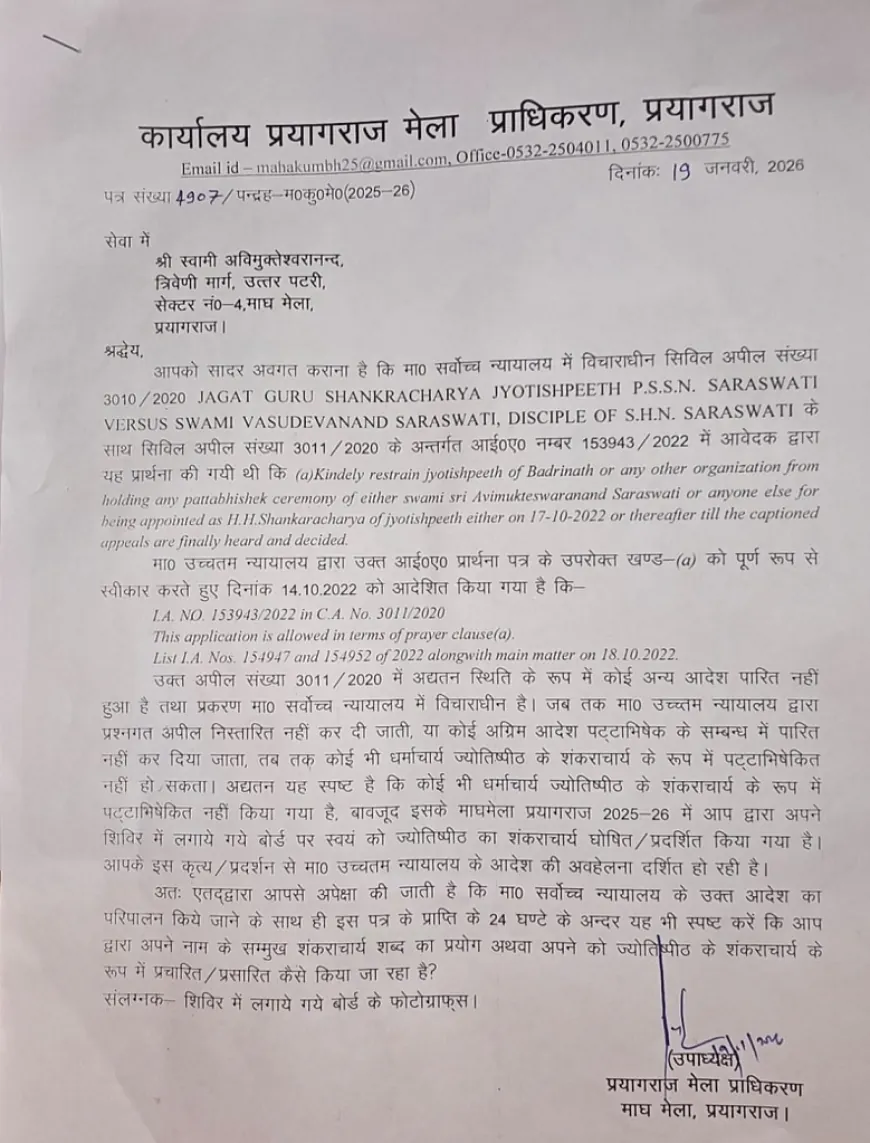मेला प्राधिकरण ने नोटिस में सुप्रीम कोर्ट में विचाराधीन सिविल अपील का उल्लेख करते हुए कहा कि अभी तक इस संदर्भ में कोई आदेश पारित नहीं हुआ है, ऐसे में कोई भी धर्माचार्य ज्योतिष्पीठ के शंकराचार्य के रूप में पट्टाभिषेकित नहीं हो सकता। बावजूद इसके स्वामी अविमुक्तेश्वरानंद ने मेला क्षेत्र में लगे शिविर के बोर्ड पर अपने नाम के आगे ‘शंकराचार्य’ अंकित किया है।