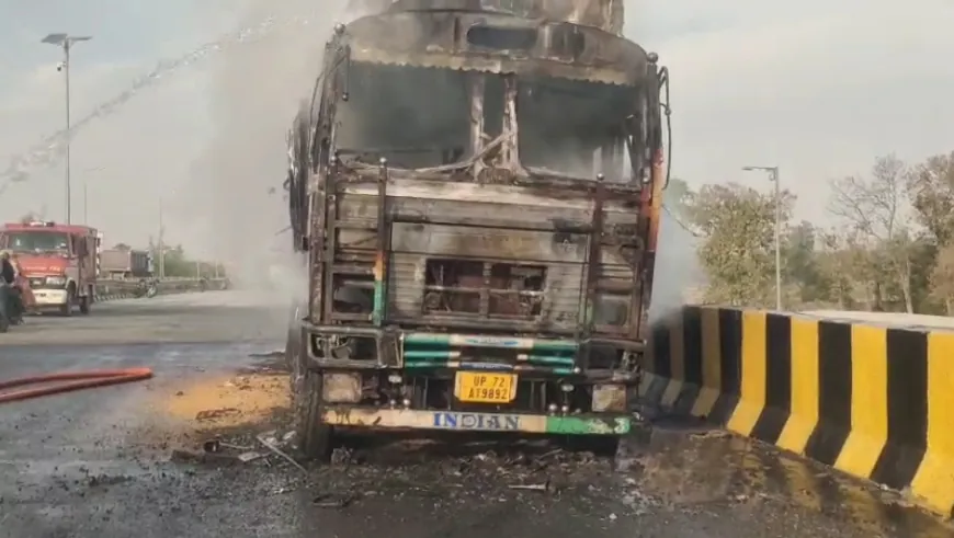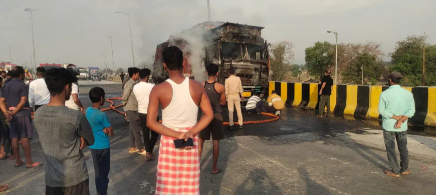 चलती ट्रक में लगी भीषण आग, शॉर्ट सर्किट से हाईवे पर मची अफरातफरी