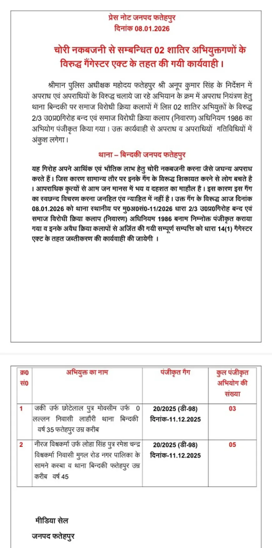 फतेहपुर/जनमत न्यूज़। उप्र के फतेहपुर जनपद में अपराधियों पर पुलिस का बड़ा एक्शन हुआ है। पुलिस ने 7 अभियुक्तों के विरुद्ध की गैंगेस्टर एक्ट के तहत कार्रवाई की।