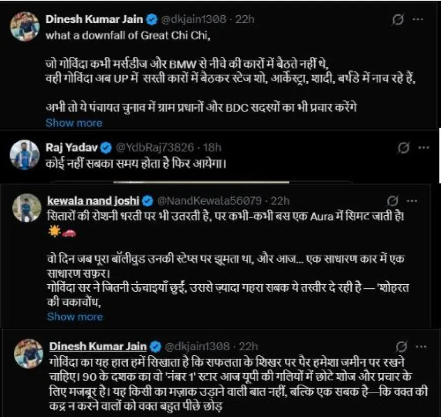 एक और यूजर ने लिखा है 'गोविंदा का यह हाल हमें सिखाता है कि सफलता के शिखर पर पैर हमेशा जमीन पर रखने चाहिए। 90 के दशक का वो 'नंबर 1' स्टार आज यूपी की गलियों में छोटे शोज और प्रचार के लिए मजबूर है।'