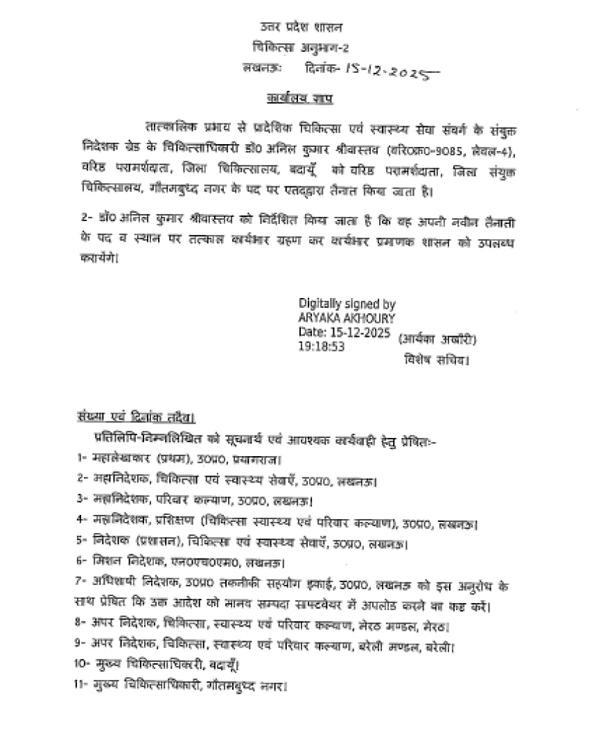इसके अलावा डॉ. अनिल कुमार श्रीवास्तव का स्थानान्तरण भी तात्कालिक प्रभाव से शासन द्वारा कर दिया गया है. उन्हें वरिष्ठ परामर्शदाता जिला चिकित्सालय, बदायूँ से वरिष्ठ परामर्शदाता जिला संयुक्त चिकित्सालय, गौतमबुध्द नगर के पद पर भेजा गया है। डॉ० अनिल कुमार श्रीवास्तव को यह भी निर्देशित किया गया है कि वह अपनी नवीन तैनाती के पद व स्थान पर तत्काल कार्यभार ग्रहण करे।